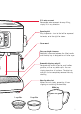 2.1L water reservoir Removable water reservoir for easy filling, simply lift in any direction. Operating dial Easy to operate – turn to the left for espresso/ hot water, or to the right for steam. Steam wand Extra cup height clearance Additional clearance between the filter handle and the drip tray is designed to suit taller cups. Removable drip tray and grill Designed with no dirt traps for small coffee granules, milk or any other spills. You can simply wipe clean all surfaces.