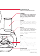 Food pusher Guides food evenly down the feed tube and can also be used to close the chute while processing to prevent food from escaping through the feed tube. Feed tube The feed tube is used to guide ingredients down into the selected blades and allows you to add ingredients during other processing tasks. Spindle Drives all the food processing attachments. The spindle must be in place to operate the food processor. Processing bowl Capacity is 1.75 litres for liquids and 1.5 kilograms for solids.