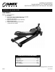 MODELO 6602LP CAPACIDAD: 2 TONELADAS GATO DE SERVICIO DE BAJO CHASIS Manual de operatión CONTENIDO: Página 9 Especificaciones 10 Ensamble 11 Instrucciones de uso, Mantenimiento de seguridad, Inspeccione, Almacenamiento adecuado, Diagnóstico de averías 12 Guía de mantenimiento del gato hidráulico, Mantenimiento regular 13 Responsabilidad del propietario/usuario e información de garantía ESPECIFICACIONES Capacidad ..............................................................
