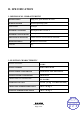 II. SPECIFICATION 1. MECHANICAL CHARACTERISTIC MOTOR DESIGN Single phase, 4-poles Brushless DC motor BEARING SYSTEM Precise Vapo bearing system DIMENSIONS See Page 6 MATERIALS OF FRAME Thermoplastic PBT of UL 94V-0 MATERIALS OF FAN BLADE Thermoplastic PBT of UL 94V-0 DIRECTION OF ROTATION Counter-clockwise viewed from front of fan blade MOUNTING HOLES Diameter 4.3 mm in 4 holes WEIGHT 33 g 2. ELECTRIC CHARACTERISTIC RATED VOLTAGE 12 VDC RATED CURRENT 45 mA / Max.