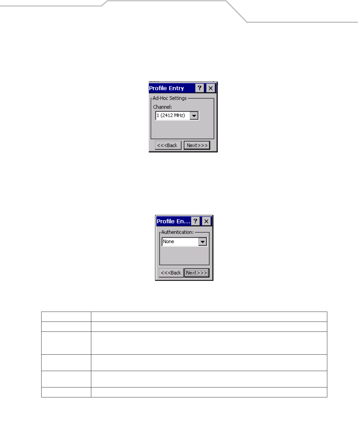 Use the Authentication dialog box to configure authentication. If Ad-Hoc mode is selected, the user can only select None because