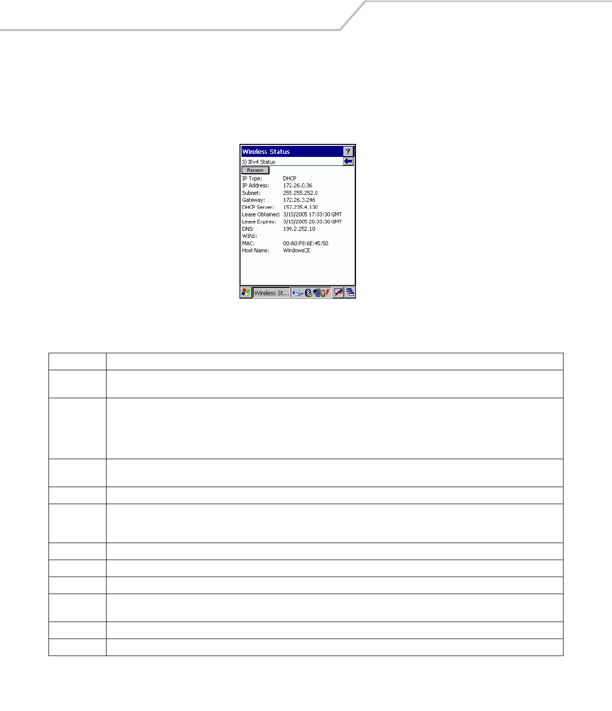 The IPv4 Status window displays the current IP address, subnet and other IP related information assigned to the mobile computer. It