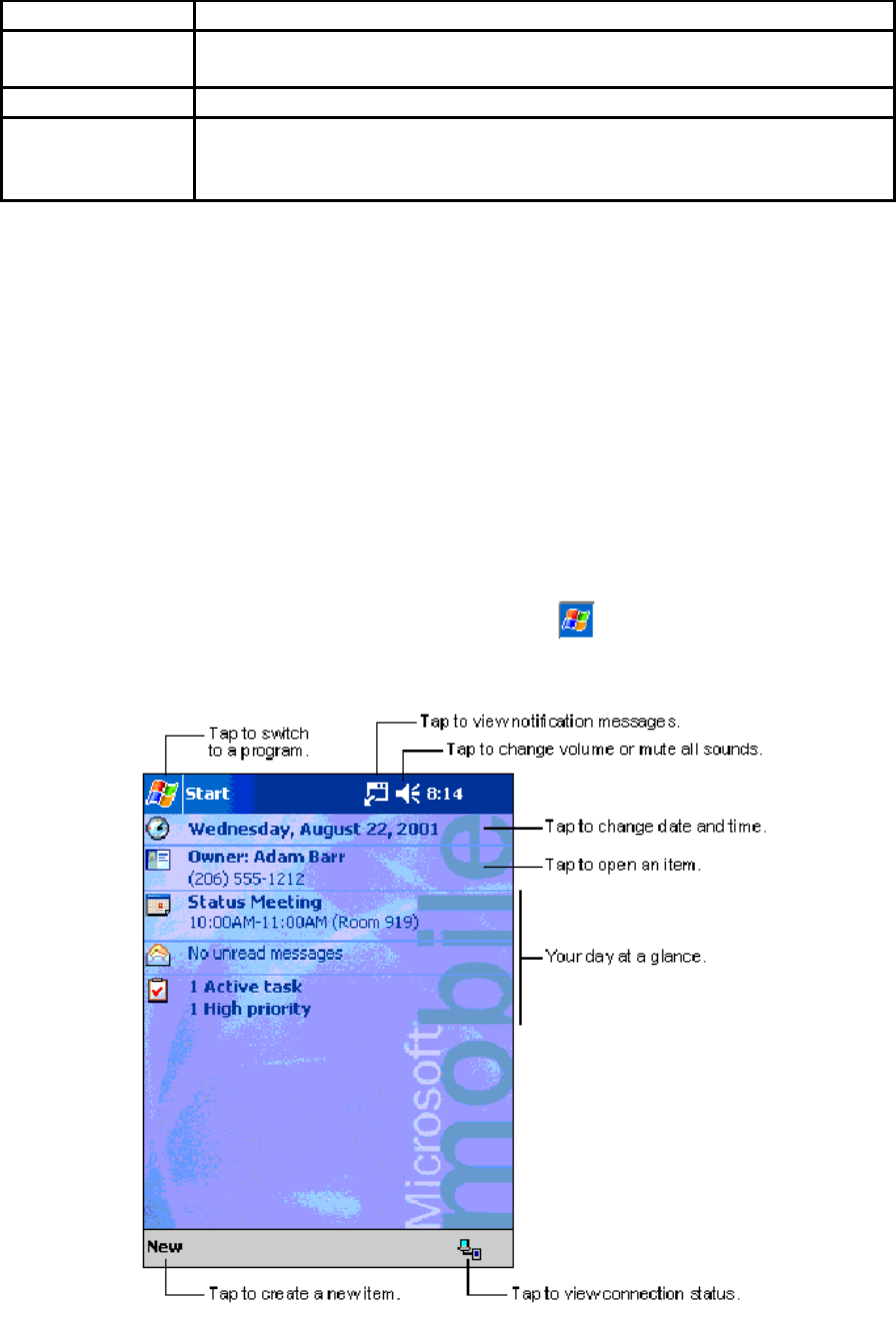 • Tap: Touch the screen once with the stylus to open items and select options.