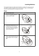 4. Clean the mouse ball and rollers. a. Remove the retainer ring on the bottom of the mouse (press in the direction of the arrow on the retainer-ring cover). b. Remove the ball from the compartment. c. Wipe the ball with a clean, lint-free cloth. d. Blow into the ball compartment to dislodge dust and lint. e. If the rollers inside the ball compartment have dirt on them, clean the rollers using a cotton swab moistened with isopropyl rubbing alcohol. f. Replace the ball and retainer ring.