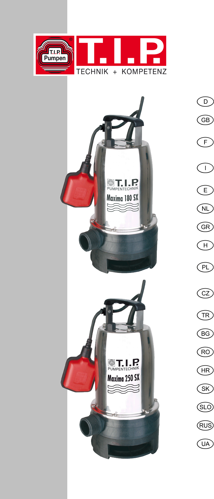 Maxima 180 SX Maxima 250 SX Gebrauchsanweisung Schmutzwasser-Tauchpumpe 01 Operating Instructions Submersible dirty-water pump 07 Mode d’emploi Pompe submersible pour eaux usées 13 Istruzioni per l’uso Pompa sommergibile per acque sporche 19 Instrucciones para el manejo Bomba sumergida de agua sucia 25 Handleiding Dompelpomp voor vuil water 31 Οδηγίες Χρήσης Υποβρύχια αντλία ακαθάρτων 37 Használati utasítás Szennyvíz merülőszivattyú 44 Instrukcja użytkowania Pompa zanurzeniowa do wody brudne