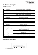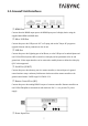 2.3.Ground Unit Interfaces ① ② ④ ③ ⑤ ① HDMI Port Connect this mini HDMI output port to the HDMI input port of a display device using the supplied Mini HDMI to HDMI cable. ② Micro USB Port Connect this port to the USB port of a PC or Laptop, and use the Taisync PC program to upgrade firmware and set parameters on the air unit.