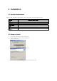 2. Installation 2.1 System Requirement Below is the minimum requirement of PC specification to run the SW properly. System CPU Memory VGA memory VGA display HDD OS others Minimum requirement Intel Core2Duo 2.0GHz or higher 2GB or higher 128MB or higher 1024 * 768 (With 32bit color) or higher 80GB or higher Windows XP SP2 or higher Direct X 9.0 or higher 2.2 Steps to install 1. Insert a provided CD to CD or DVD rom. 2. Click ‘Setup.exe’ file to start installation. 3. Select a Language 4.