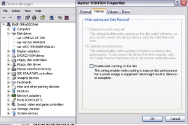 a drive. Choose Properties and uncheck “Write Cache Enabled”. Repeat for all drives in