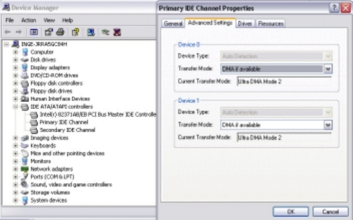 Settings” tab. Transfer mode should be set to “DMA if available” (not PIO) and Device