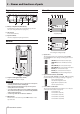 3 – Preparation Powering the unit This unit uses a built-in rechargeable lithium-ion battery. This unit can also be powered by 2 AA batteries, by using a commercially-available USB cable to supply USB bus power or by a TASCAM PS-P520E AC adapter. The USB cable can also be connected a TASCAM BP-6AA external battery pack ( sold separately). This unit can use alkaline, Ni-MH or lithium AA batteries. Using AA batteries 1. Slide the battery compartment cover toward the bottom of the unit to open it. 2.