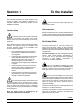 Section 1 To the Installer The following information has been included in the manual as safety and regulatory guidelines. For complete installation instructions, please see the Installation Checklist. This unit has many sharp edges that can cause severe injuries. Site Preparation Installer Safety Review the area where the unit will be installed before uncrating the unit. Make sure that all possible hazards to the user and the equipment have been addressed.