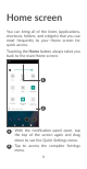 Home screen You can bring all of the items (applications, shortcuts, folders, and widgets) that you use most frequently to your Home screen for quick access. Touching the Home button always takes you back to the main Home screen. 1 2 1 : With the notification panel open, tap the top of the screen again and drag down to see the Quick Settings menu. Tap to access the complete Settings 2 : menu.