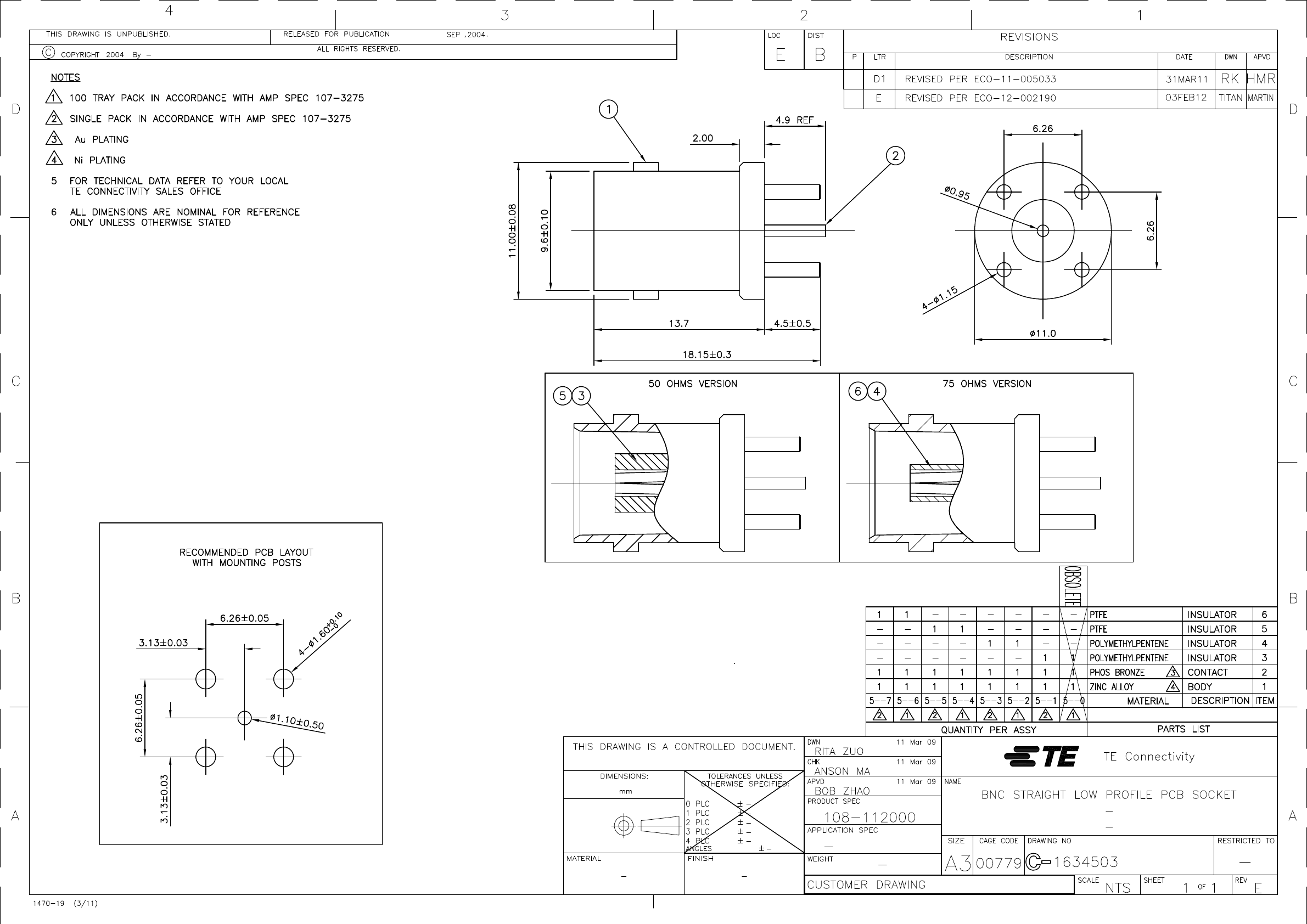 4 3 2 THIS DRAWING 1S UNPUBLISHED. RELEASED FOR PUBLICATION SEP , 2004 Loc DIST REVISIONS © ALL RIGHTS RESERVED. COPYRIGHT 2004 DESCRIPTION DATE DWN | AVDP NOTES D1 | REVISED PER 31maR11 | RK HMR /A\ 100 TRAY PACK IN ACCORDANCE WITH AMP SPEC 107-3275 E | REVISED PER O3FEB12 | TITAN [MARTIN /A\ SINGLE PACK IN ACCORDANCE WITH AMP SPEC 107-3275 4.9 REF 6.26 /AL Au PLATING 2.00 L /A NI PLATING _ . 5 FOR TECHNICAL DATA REFER TO YOUR LOCAL TE CONNECTIVITY SALES OFFICE %0.
