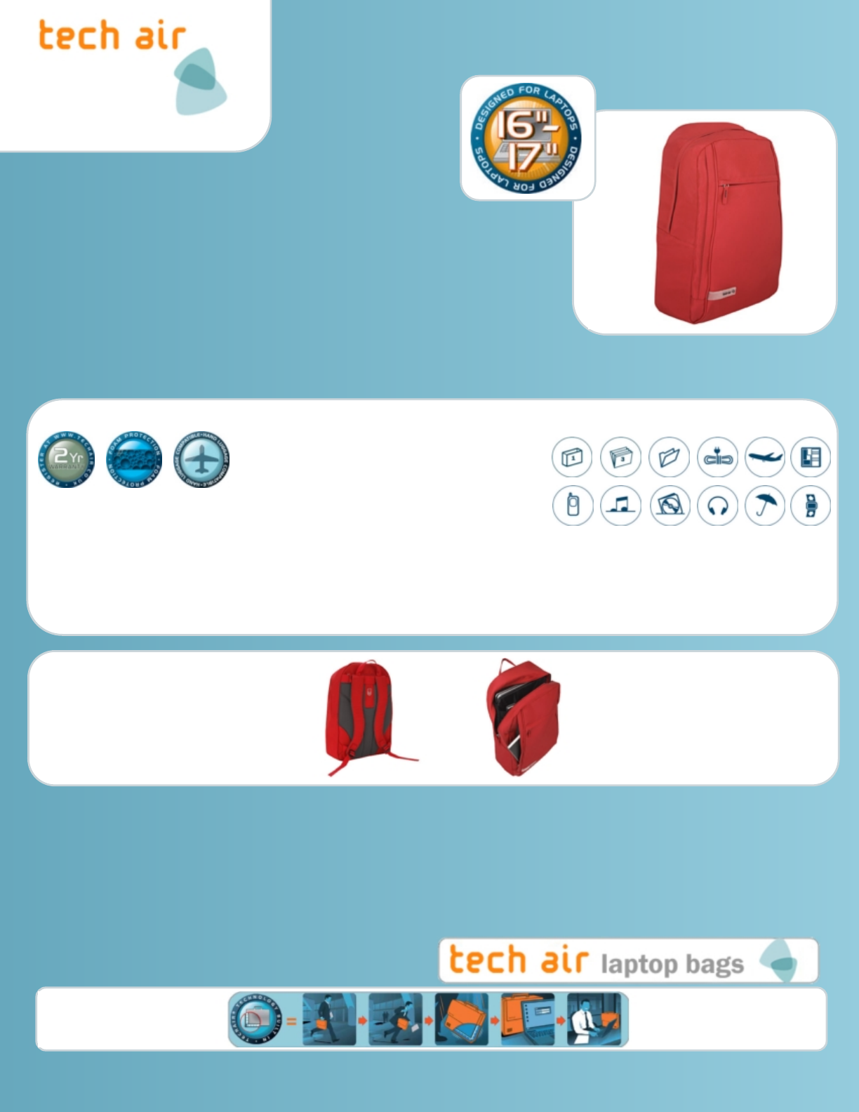 2 year warranty, adjustable shoulder straps, showerproof, document & cable friendly,