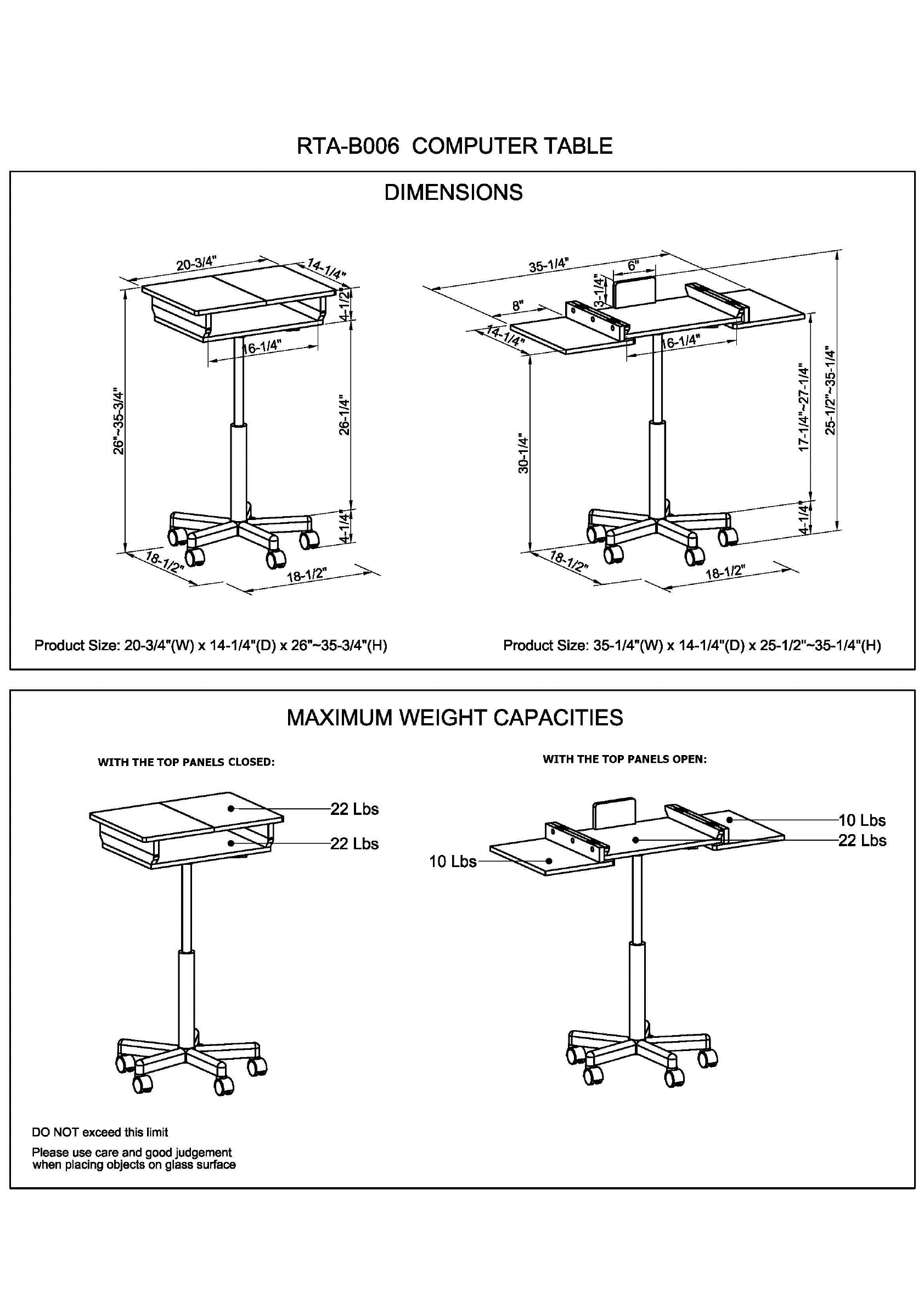 R TA-B006 COMPUTER TABLE DIMENSIONS Product Size: x x Product Size: x 14-144" (D} x MAXIMUM WEIGHT CAPACITIES WITH THE TOP PANELS CLOSED: WITH THE TOP PANELS OPEN: DO NOT exceed this limit Please use cars and good judgment when placing objects on glass surface