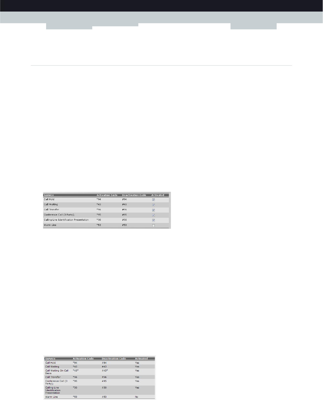 5 In the Te l e p h o n y S e r v i c e s table, you can find the activation and deactivation codes.