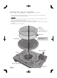 Putting the player together (continued) In order to prevent damage during shipping, some of the equipment has been disassembled. Put the player together in the following order. Attention Before setting up, put on the stylus guard to protect the stylus tip, return the tone arm to the arm rest and fix it with the arm clamp. Do not connect the AC power supply cord until set up is complete. When fitting the turntable, prevent foreign material from getting in between the main unit and turntable.