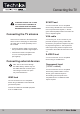 Connecting the TV WARNING! ENSURE THE TV AND ALL ANCILLARY EQUIPMENT IS UNPLUGGED FROM THE MAINS BEFORE MAKING ANY CONNECTIONS! Connecting the TV antenna Connect the TV antenna to the aerial socket with a 75 ohm co-axial plug. For best results use a high gain TV aerial, preferably roof or loft mounted. • To improve picture quality in a poor signal area, purchase and install a signal ampli er. • If the antenna needs to be split for two TV‘s, use a 2-Way Signal Splitter (not supplied).