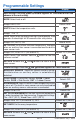 Programmable Settings Setting Display User settings. Press the and advance to the next setting. buttons together for 3 seconds to enter and MODE Select heat or off. Range: HEAT, OFF Default: HEAT UNITS Select the temperature units. Range: °F or °C Default: °F LIGHT Select when the display back light should operate. Auto operates the backlight for 30 seconds after a keystroke. Range: OFF, AUTO, ON Default: AUTO SET FLOOR Set the floor minimum temperature.