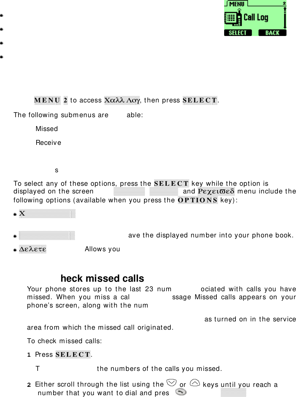 m issed. When y ou m iss a call( s) , t he m essage Missed calls appear s on y our