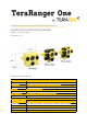 Copyright © Terabee 2016 Safety Notes The TeraRanger One is eyesafe in all conditions, including system failure. However, please keep a minimum of 20cm distance from your eyes when handling the sensor under power and do not look into the LEDs with any kind of optical instruments. Table of Contents 1 2 3 5 6 7 8 About the TeraRanger One 1.1 Inside the Package 1.2 USB adapter 1.3 Dimensions and Mounting 1.4 About the Connector 1.5 UART Data Interface 1.6 TWI (I2C) Data Interface 1.7 USB Interface 1.