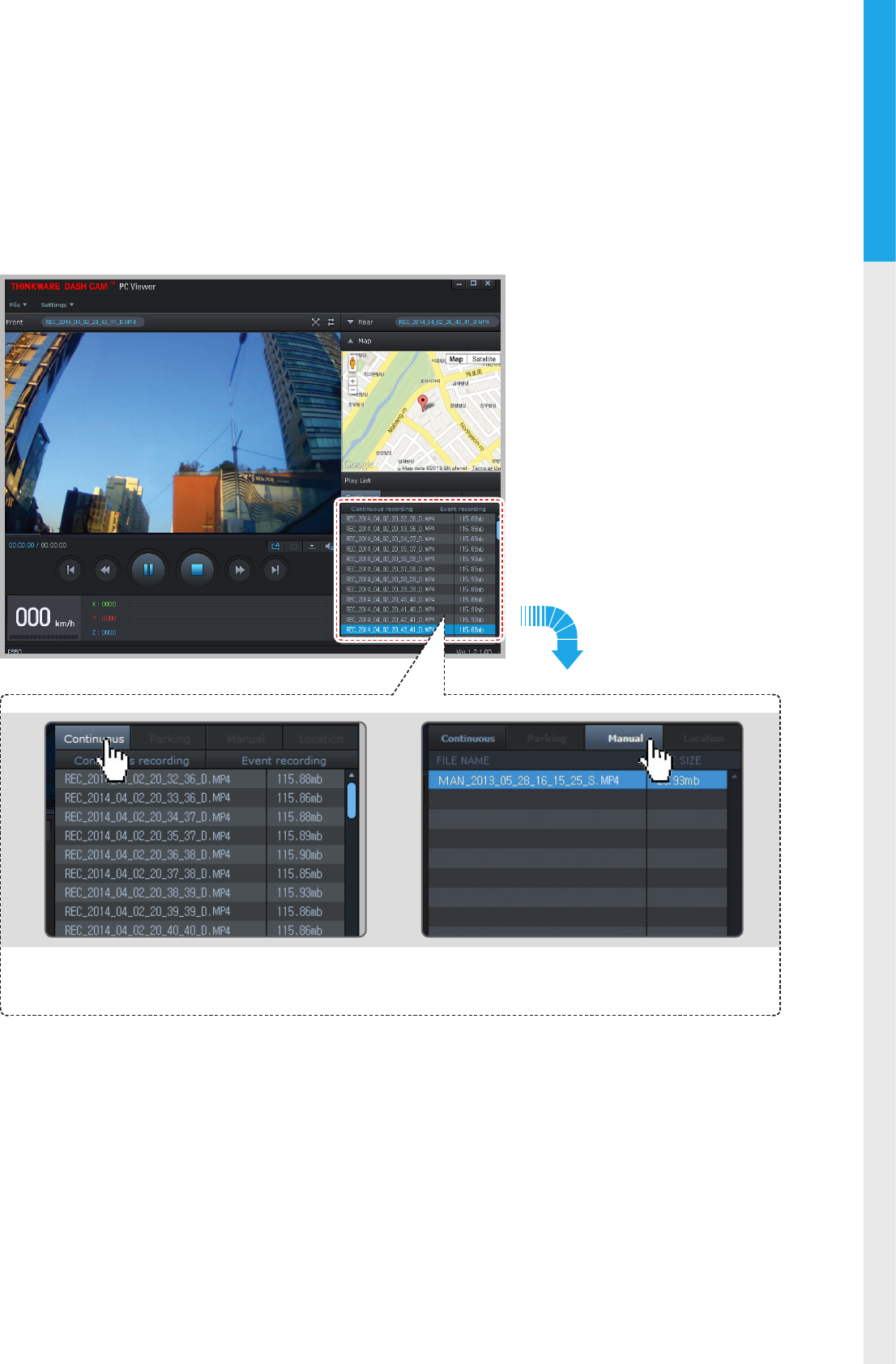Sélectionnez le dossier approprié (Enregistrement continu, Enregistrement d'accident, Enregistrement
