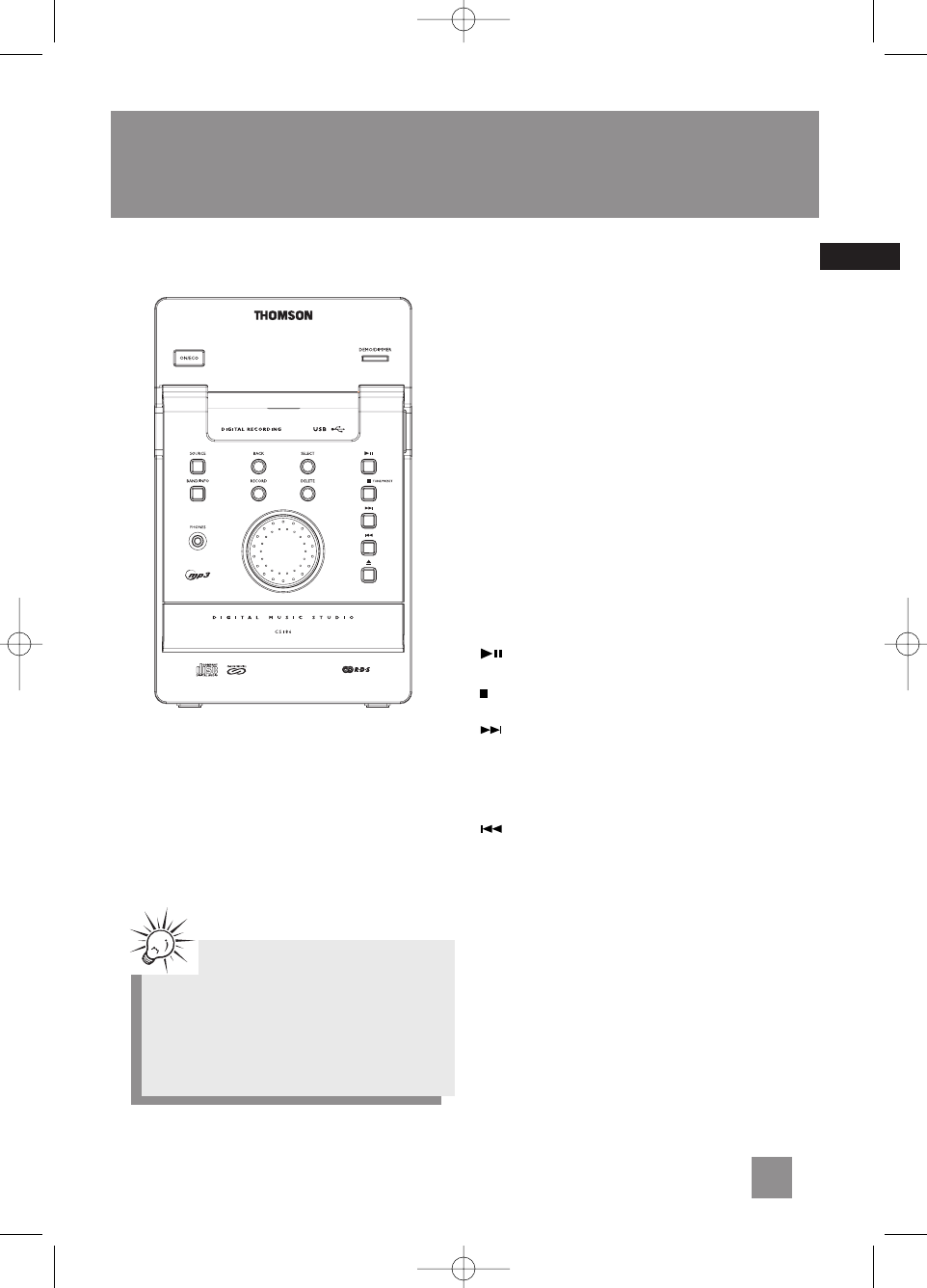 SOURCE - Selects among CD player, tuner, USB