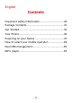 English Contents Important safety information.................................24 Package Contents...................................................31 Get Started.............................................................31 Your Phone………..….............................…..….…………36 Powering on your device........................................37 How to select your mobile operator......................38 Dual SIM management...........................................39 MP3 player............................