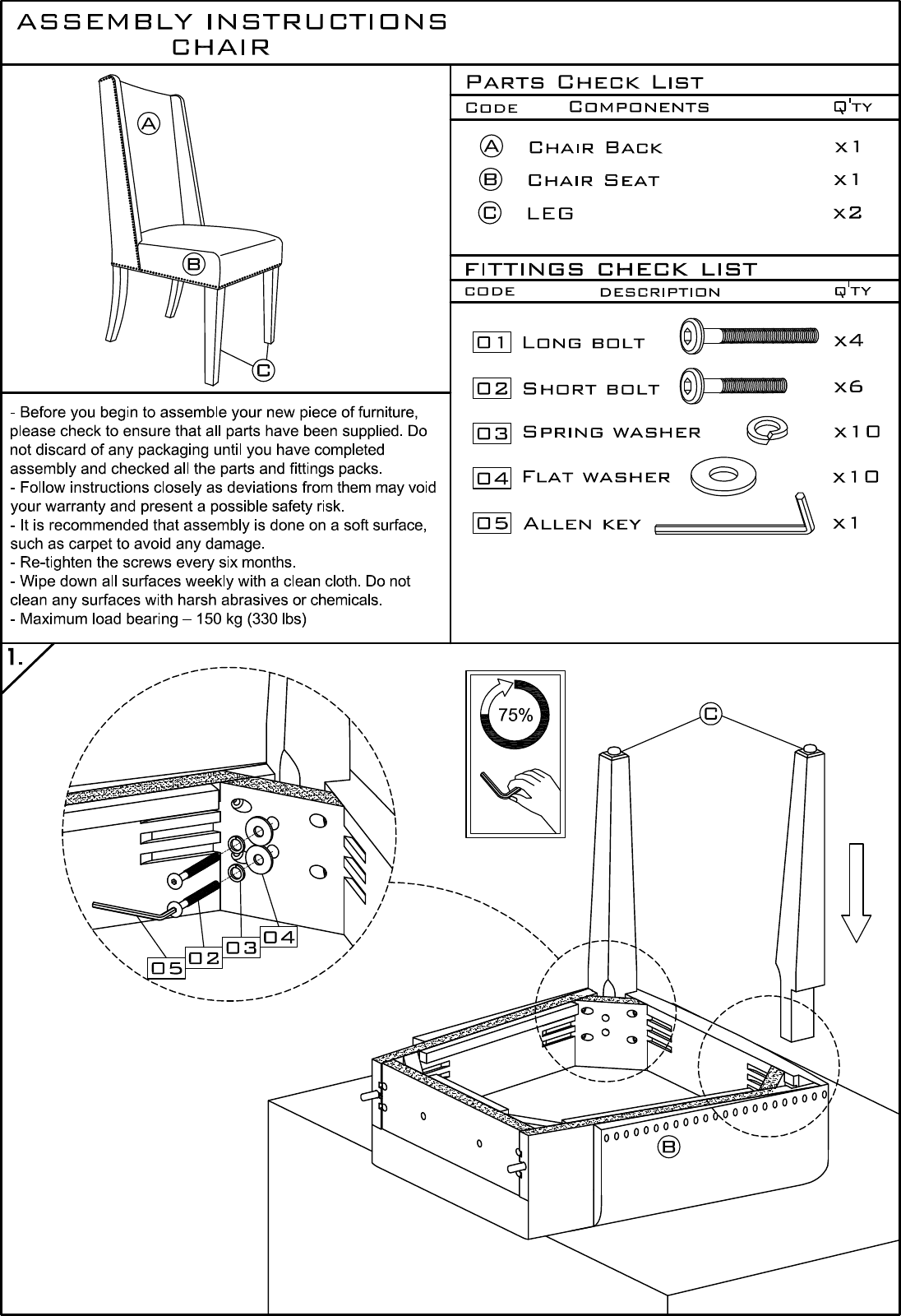 ASSEMBLY INSTRUCTIONS CHAIR PARTS CHECK LIST Before you begin to assemble your new piece of furniture, please check to ensure that all parts have been supplied. Do not discard of any packaging until you have completed assembly and checked all the parts and fittings packs. Follow instructions closely as deviations from them may void your warranty and present a possible safety risk. Iris recommended that assembly is done on a soft surface, such as carpet to avoid any damage.