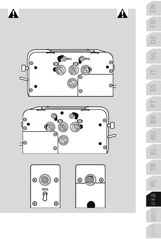 ベース部前面および背面 = これらのねじは絶対に締めたり緩めたりしないでください: