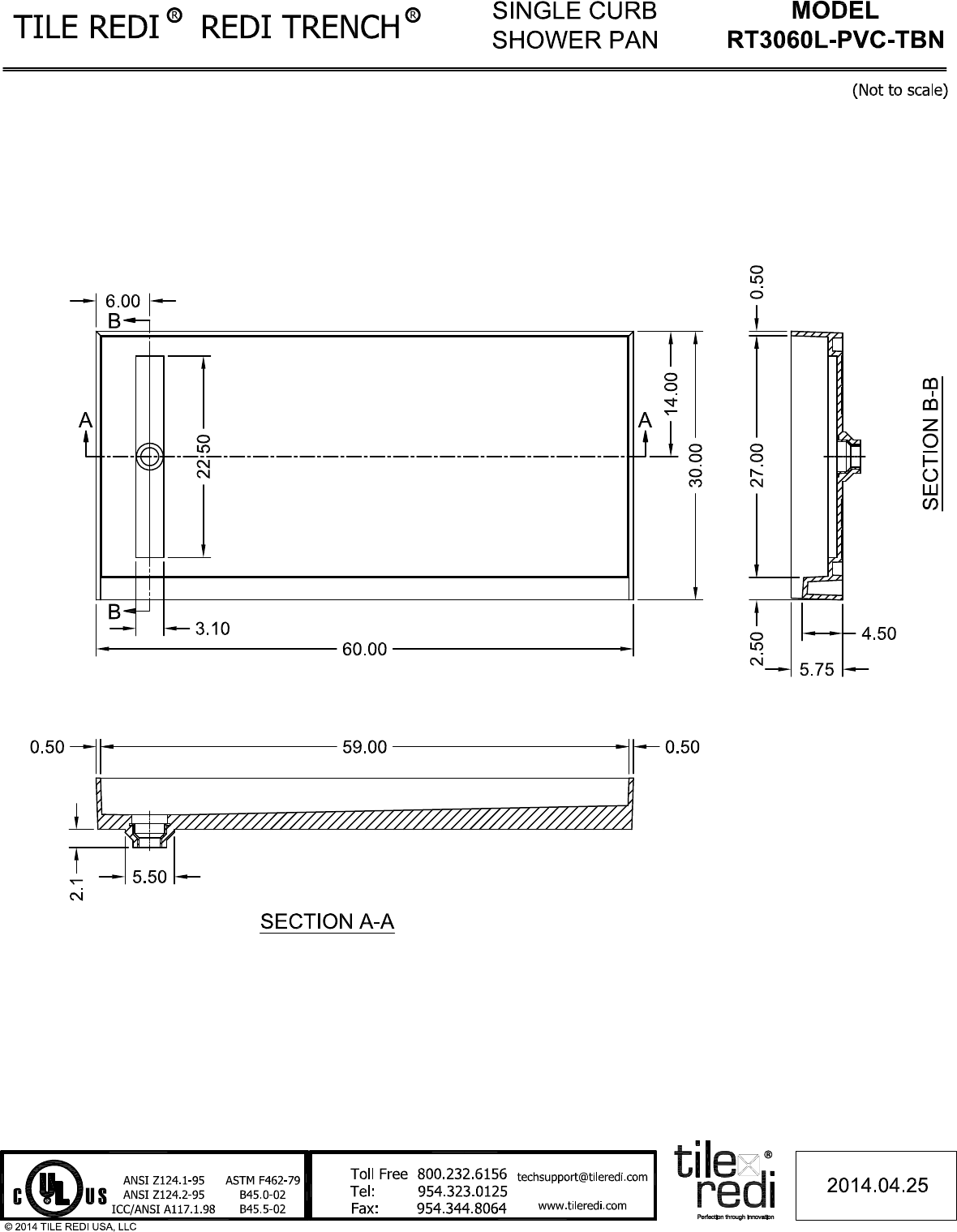 Redi Trench 60"W x 30"D Shower Pan with Left Tileable Linear Drain