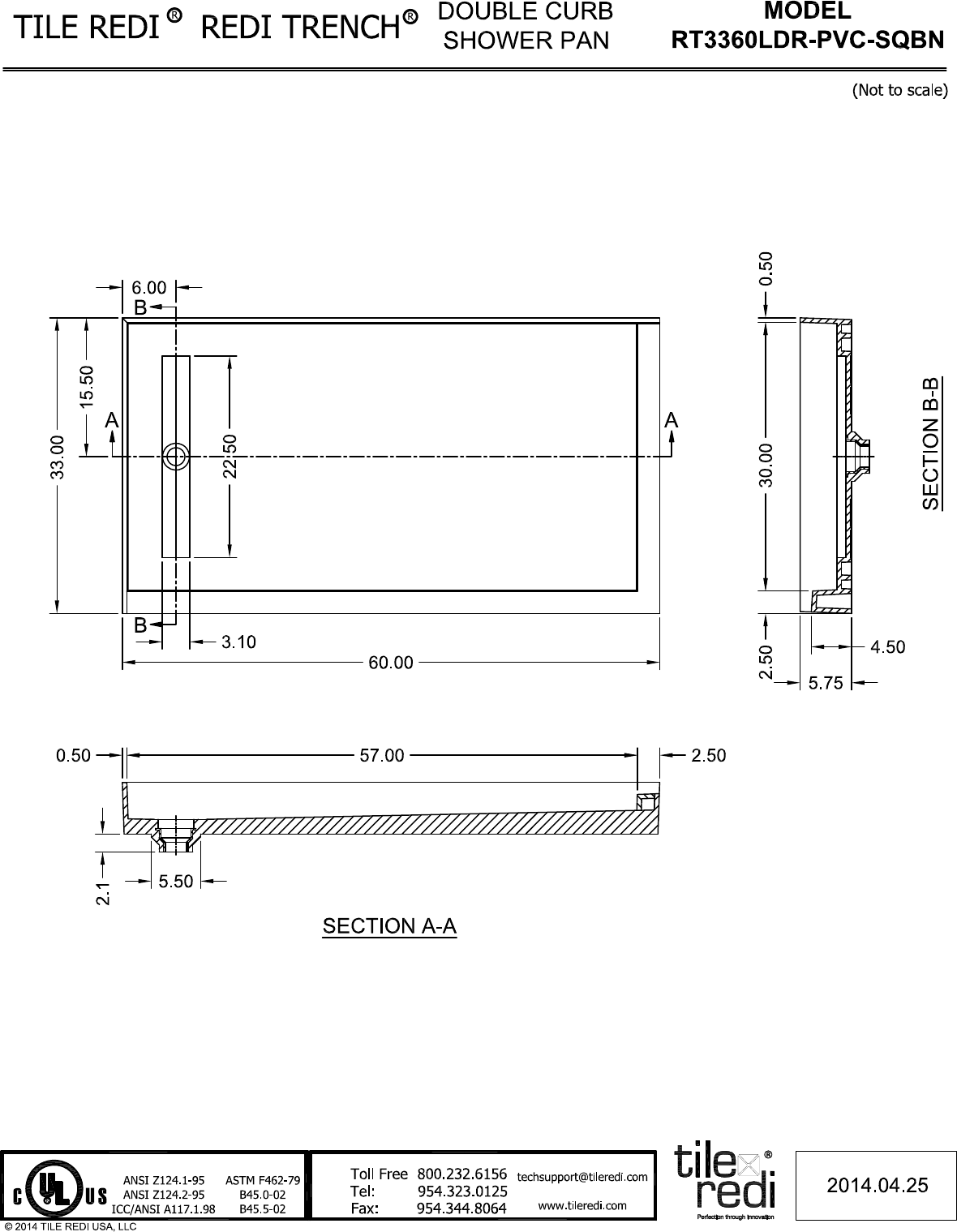 Redi Trench 60"W x 33"D Dual Curb Shower Pan with Left Trench Drain