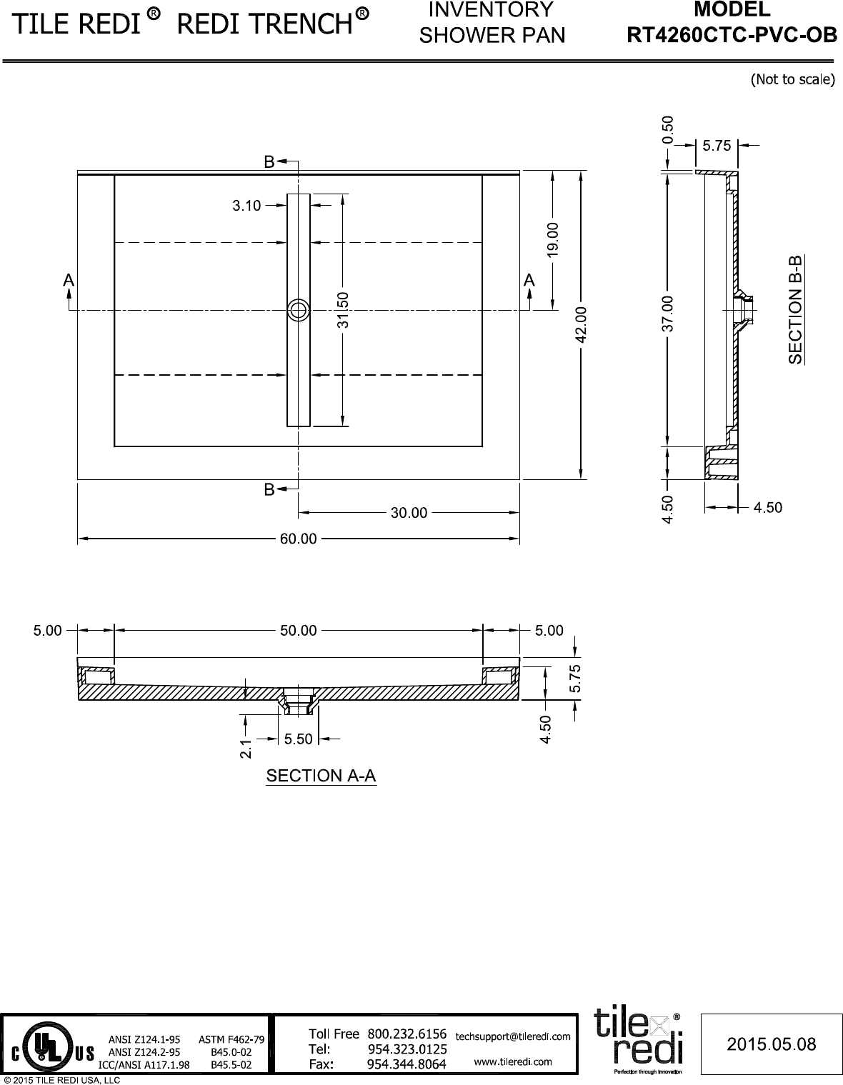 Redi Trench 60"W x 42"D Triple Curb Shower Pan with Center Linear Drain