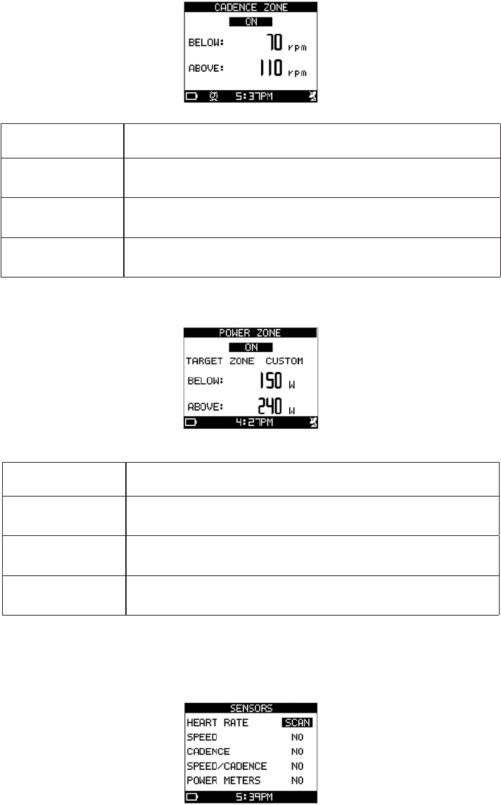 ZONA CADENZA Selezionare ON per essere avvertiti quando i giri al minuto del pedale della
