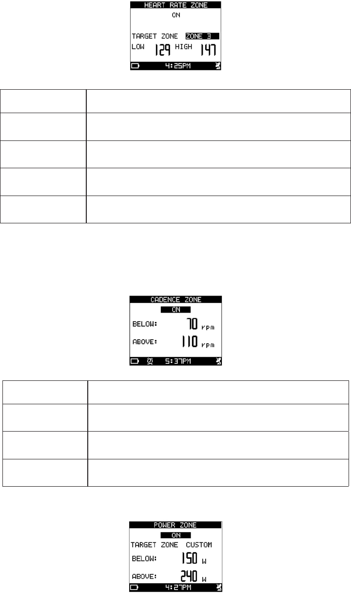 ZONE FRÉQ CARDIAQUE Sélectionnez ON pour être alerté si la fréquence cardiaque est en dehors des