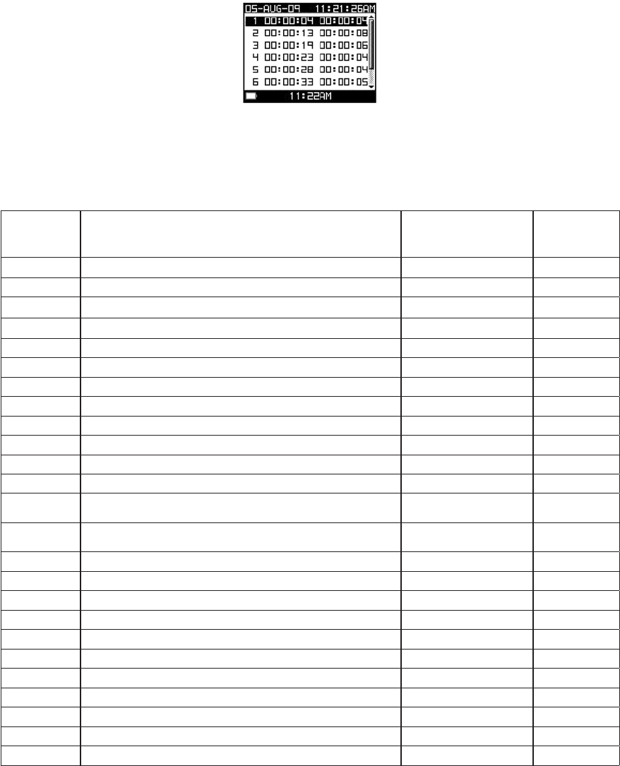 2. Oprima q para seleccionar VIEW LAPS, después oprima 8 . Aparece la Lista de Vueltas.