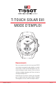 T-TOUCH SOLAR E81 MODE D’EMPLOI Remerciements Nous vous remercions d’avoir choisi une montre TISSOT, une marque suisse parmi les plus réputées au monde. Votre montre T-TOUCH SOLAR E81 bénéficie des innovations techniques les plus récentes. Elle vous offre un affichage analogique permanent de l’heure ainsi qu’un affichage numérique varié. En plus de cela, les fonctions suivantes sont accessibles par un simple toucher de la glace: Météo, Altimètre, Chronographe, Boussole, Alarme et Compte à rebours. w ww.