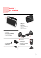 Kapittel 1 Hva er i esken Hva er i esken a TomTom GO A Utløserknapp B Mikrofon C Ladelys D Av/på-knapp E Lyssensor F Tilbakestillingsknapp G Høyttaler H Minnekortspalte* b Dokkingenhet for frontrute A Lydutgang B Ekstern mikrofontilkobling C Ekstern antennetilkobling D Strømtilkobling E TomTom-tilkobling c Hjemmedokkingenhet A Strømladertilkobling B USB-tilkobling e Billader d Fjernkontroll+ A Volumkontroll B OK-knapp C Pilknapper D Venstre- og høyreknapp E Tastaturknapp f Bæreveske • • • 3 • • •