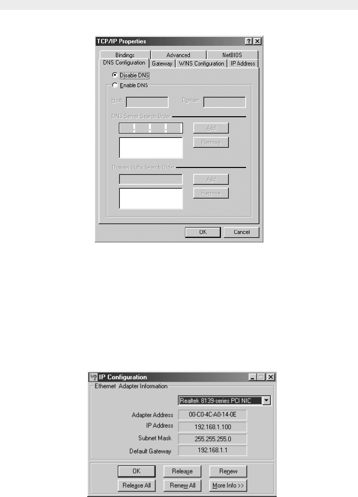 Inside the windows 95/98/ME Start button, select Run and type winipcfg. In the example below this computer has a
