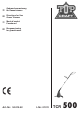 D 4. Technische Daten: TCR 500 Netzspannung: 7. Vor Inbetriebnahme 230 V ~ 50 Hz Leistung 500 Watt Schnittkreis Umdrehungen n0 Nylon-Schneidfaden Ø 30 cm 10.500 min-1 Ø 1,4 mm Schalldruckpegel LPA 81 dB(A) Schalleistungspegel LWA Vibration aw 92 dB(A) 2,5 m/s2 Gewicht Art.-Nr.: Durch die Höhenverstellung und Verstellung des Zusatzhandgriffes kann eine optimale Arbeitsposition eingestellt werden. 3 kg 34.015.42 Das Geräusch der Maschine kann 85 dB(A) überschreiten.