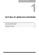1. Setting Up Wireless Network SETTING UP WIRELESS NETWORK 1. This section describes about the preparations before setting up the wireless settings of the equipment. • Before Setting Up Wireless Network.............................................................................................10 • Setting Up the Infrastructure Mode ...............................................................................................13 • Setting up the Ad Hoc Mode ..........................................