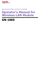 MULTIFUNCTIONAL DIGITAL SYSTEMS Operator’s Manual for Wireless LAN Module GN-1060 2-17-2, HIGASHIGOTANDA, SHINAGAWA-KU, TOKYO, 141-8664, JAPAN ©2010 TOSHIBA TEC CORPORATION All rights reserved R100520J2800-TTEC VerB 2010-07