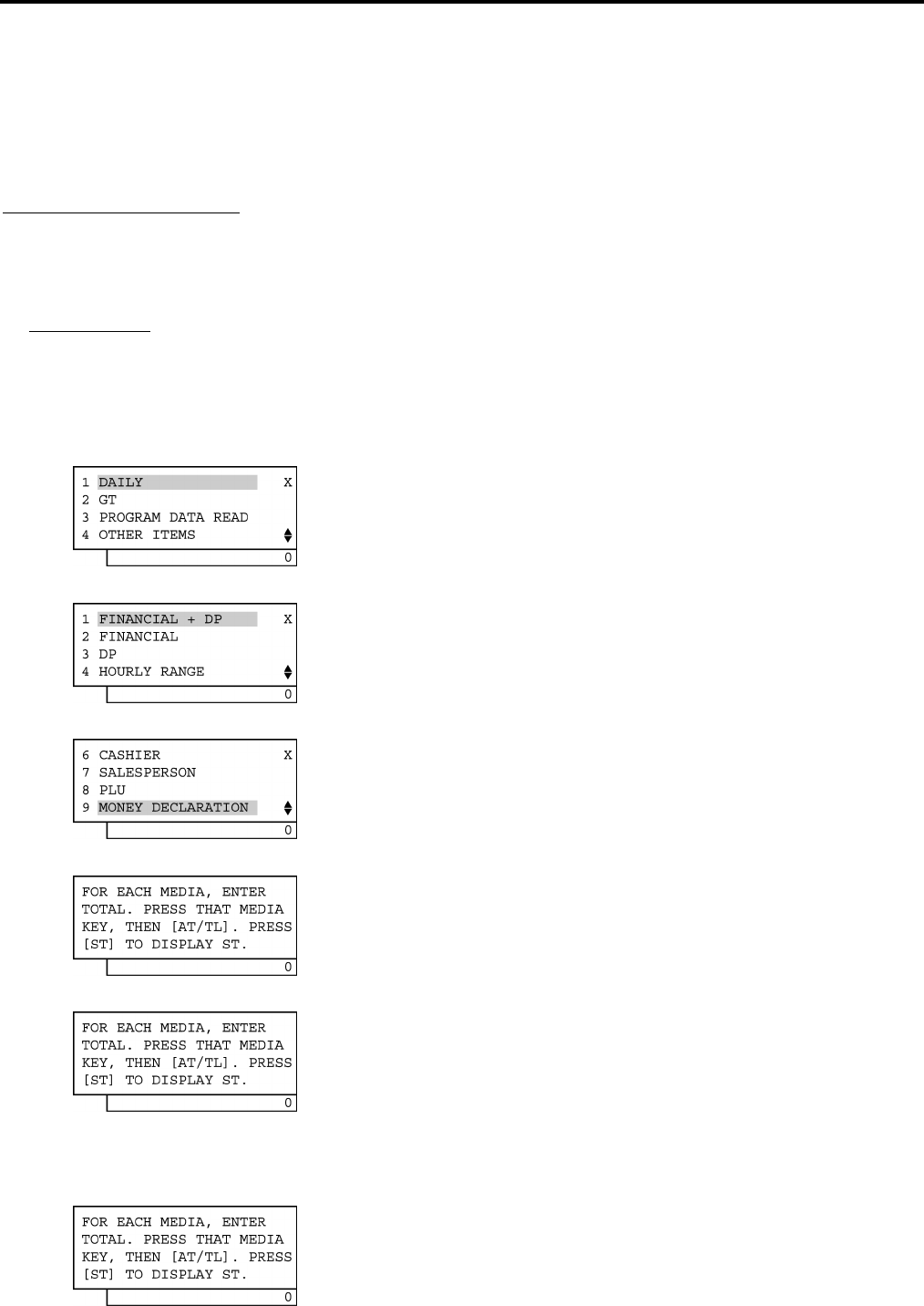 When the Money Declaration feature is selected, each cashier who has operated the ECR on the day must end