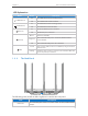 Chapter 1 Get to Know About Your Router LED Explanation Name (2.4GHz Wireless) ( 5GHz Wireless) (Ethernet) On The 2.4GHz wireless band is working properly. Off The 2.4 GHz wireless band is disabled. On The 5GHz wireless band is working properly. Off The 5GHz wireless band is disabled. On At least one Ethernet port is connected. Off No Ethernet port is connected. Blue On (Internet) Orange On Off Internet is available.
