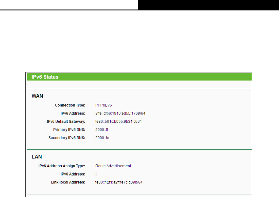 The IPv6 Status page displays the router's current IPv6 status and configuration. All information
