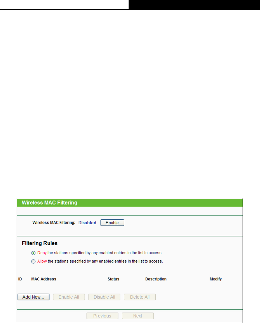 To filter wireless users by MAC Address, click Enable. The default setting is Disabled.