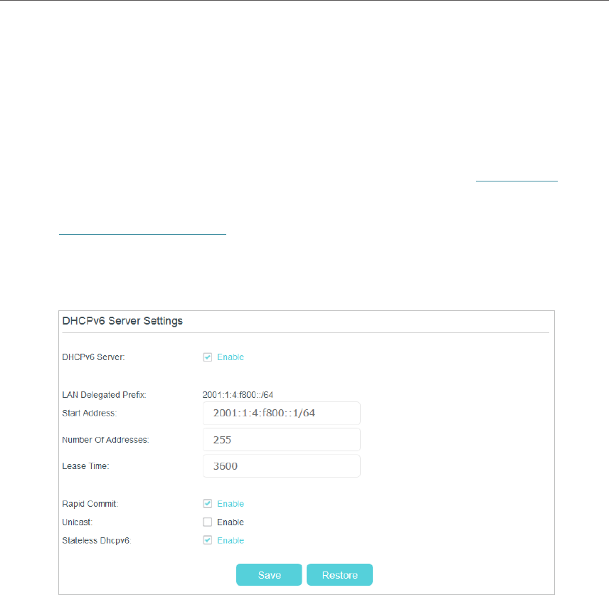 3. Go to Advanced > Network > IPv6 LAN Settings. In the DHCPv6 Server Settings