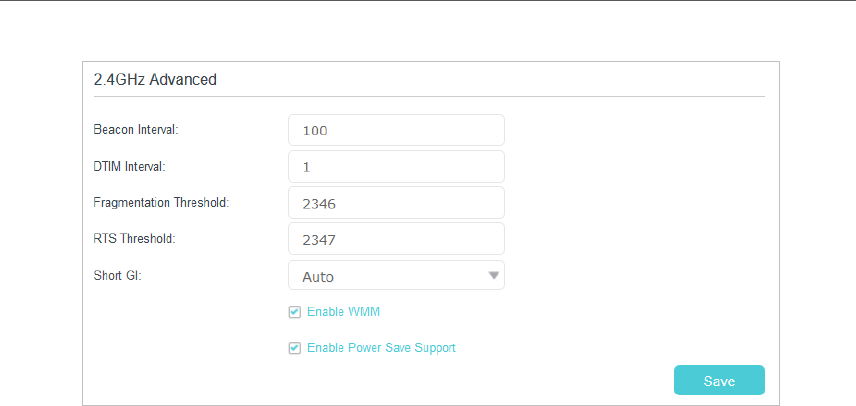 • Short GI: This feature is enabled by default and recommended to increase the data