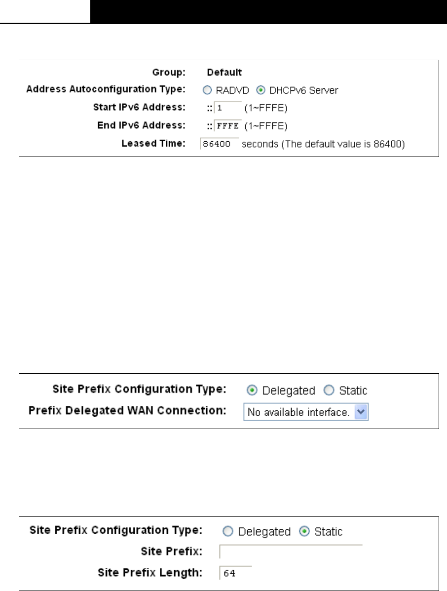 Site Prefix Configuration Type: Select a type to assign prefix to IPv6 addresses. Delegated