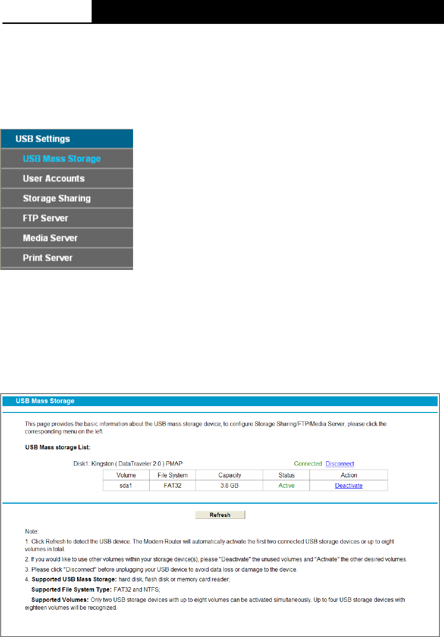 There are six submenus under the USB Settings menu, USB Mass Storage, User Accounts,